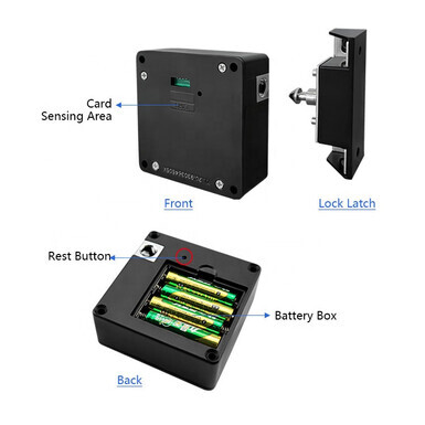 Умный замок деревянной дверцы ящика Материал: пластиковый корпус + язычок замка из нержавеющей стали толщиной 8,5 мм. Режим питания: 4 батарейки типа ААА (не входят в комплект). Если цикл питания превышает 365 дней, имеется функция напоминания о низком